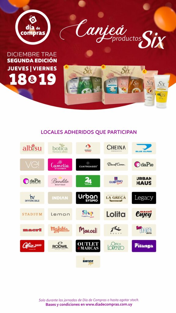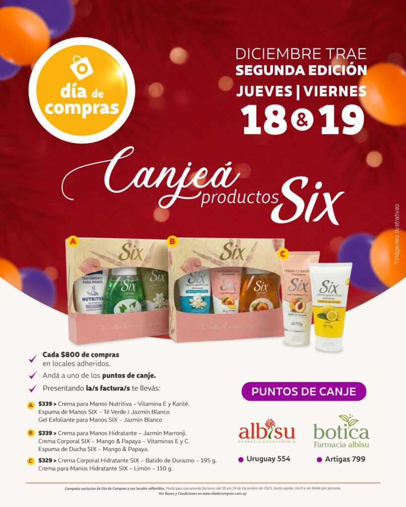 Día de Compras presenta su canje especial de diciembre con productos de perfumería y cuidado personal de la línea SIX, gracias a la colaboración de Farmacia Albisu y Farmacia Botica.
