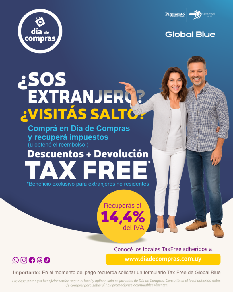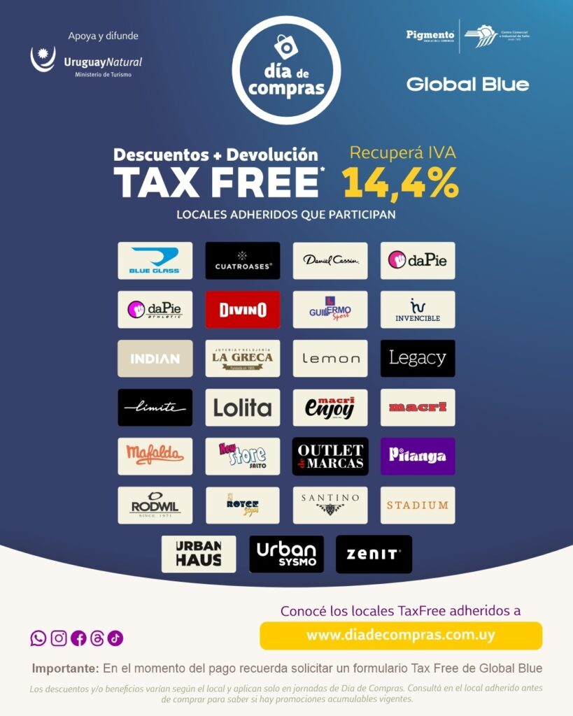 Pero eso no es todo: si sos extranjero no residente en Uruguay, durante Día de Compras podés aprovechar un beneficio adicional gracias al sistema Tax Free. Esto significa que, además de las promociones exclusivas de cada jornada, podés recuperar el 14,4% del IVA de tus compras realizadas en los locales adheridos.